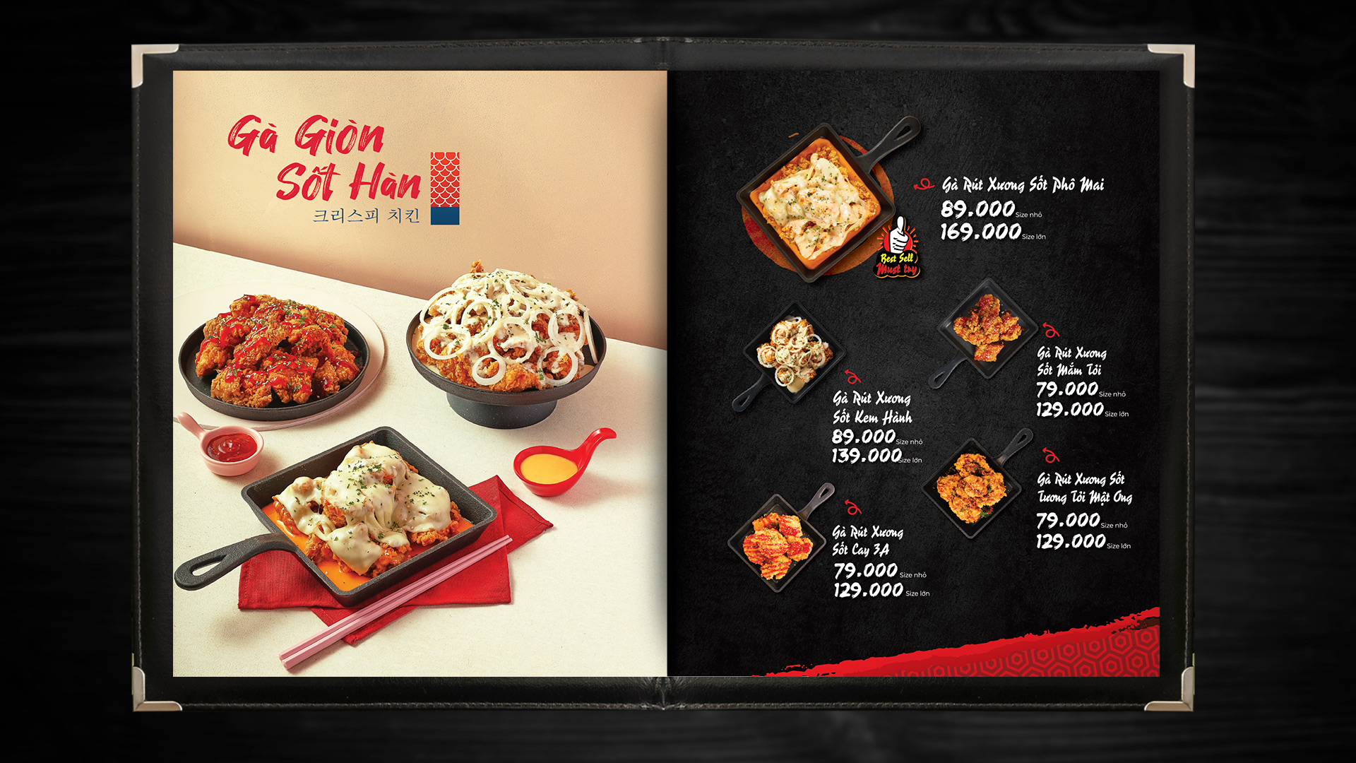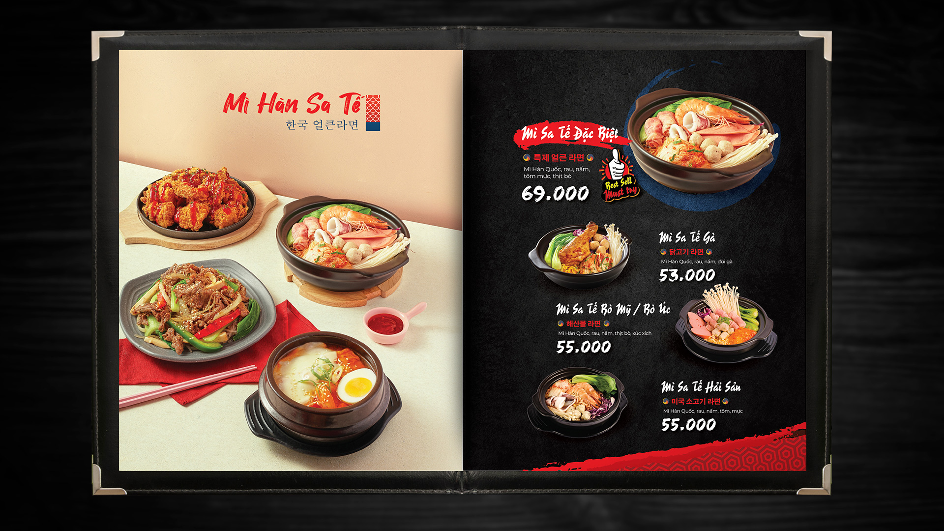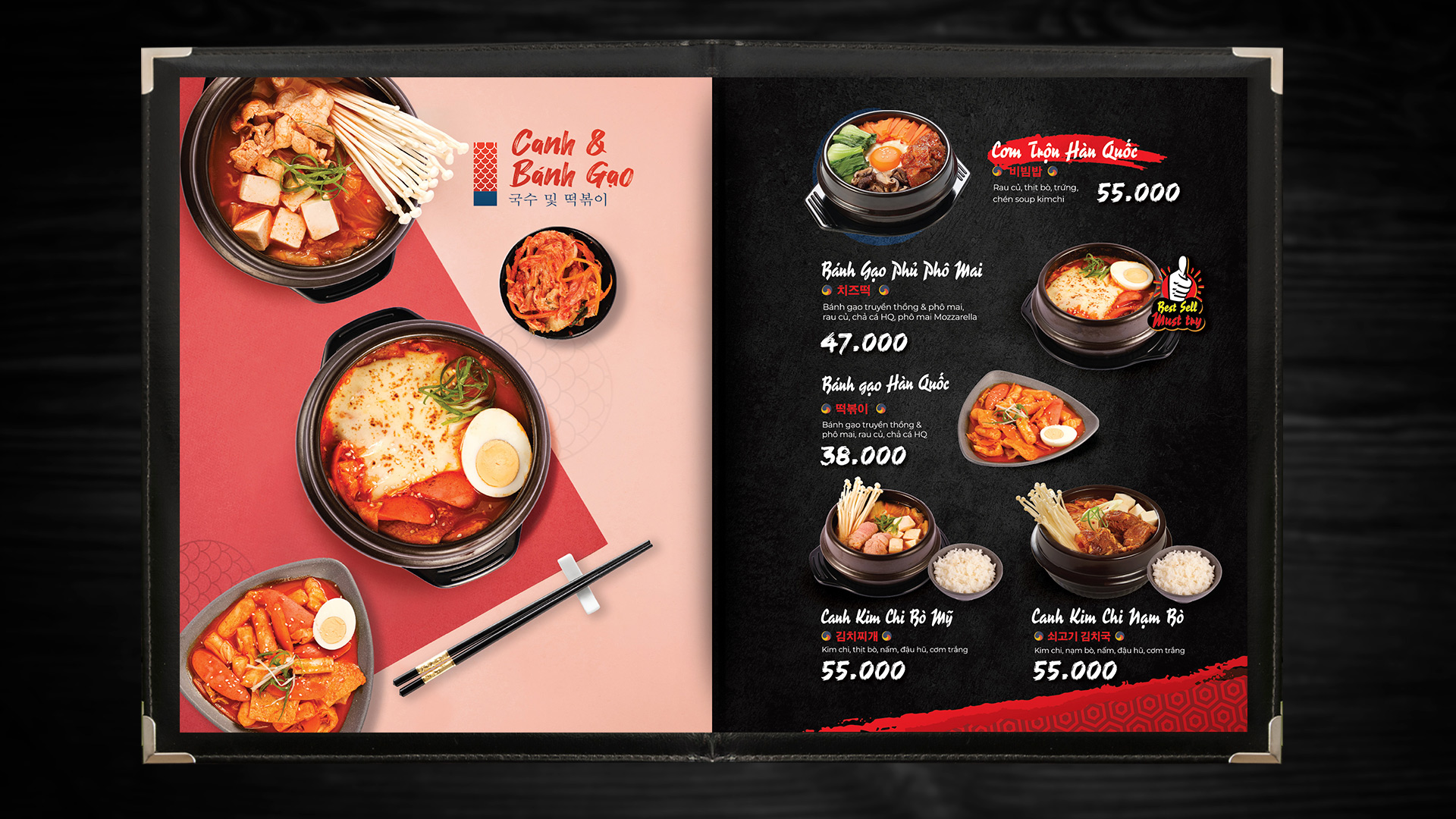 Menu design for 3A Korean Food – a Korean fast-food chain. The layout features a bold black–red palette, appetizing food imagery, and traditional Korean motifs to enhance brand identity. Designed for both print and digital display at the counter.